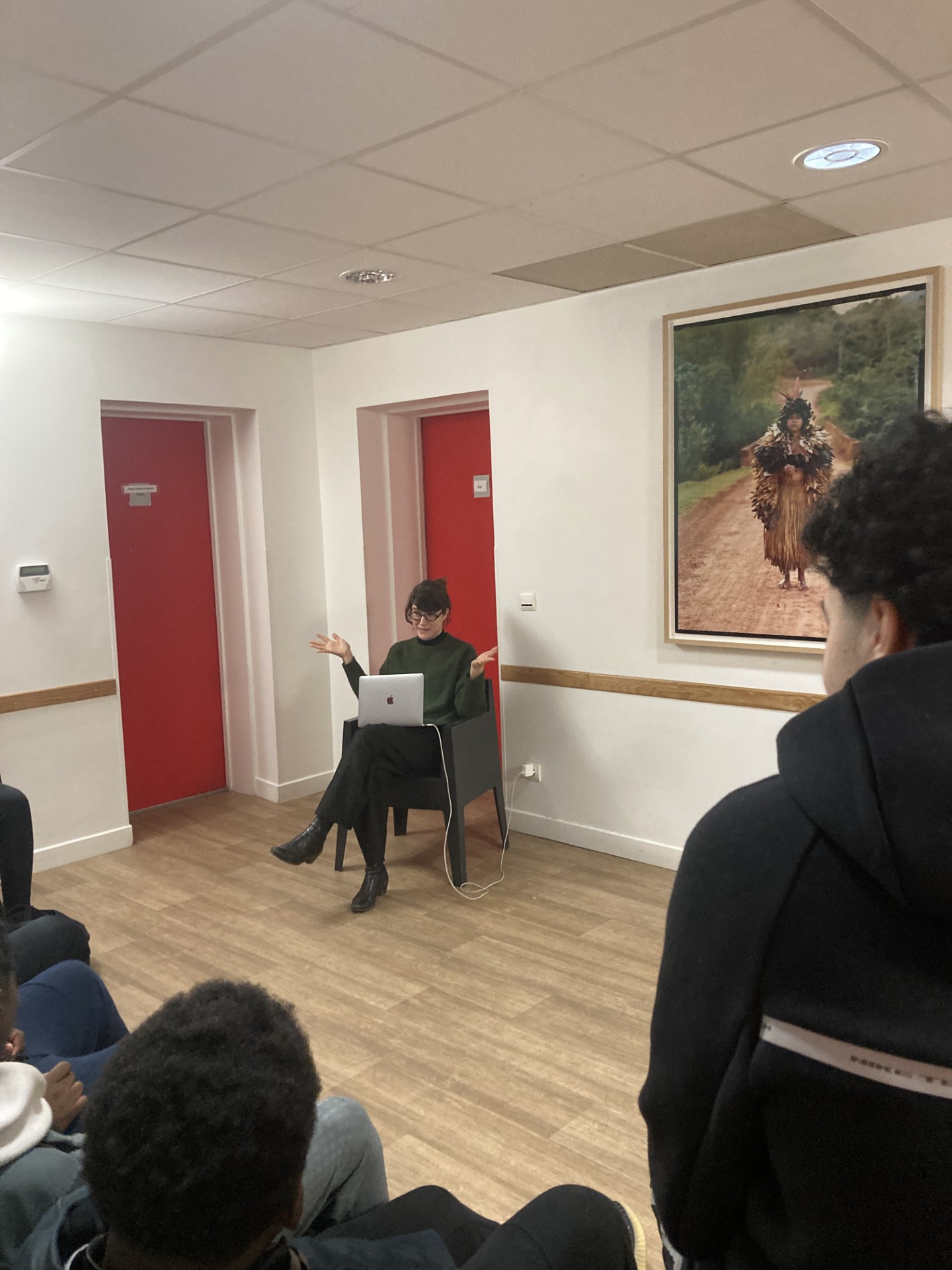 Le mercredi 21 janvier, l'artiste est intervenue au centre d'animation pour une rencontre avec des usager.e.s, adultes et adolescent.e.s. L'artiste a partagé des anecdotes sur son travail et l'histoire du Brésil. Cette rencontre a permis aux participant.e.s de questionner leurs représentations du Brésil et des peuples autochtones. Par exemple, l'artiste a expliqué, que par rapport à la France, il est très compliqué de faire son arbre généalogique au Brésil car de nombreuses familles sont issues d'histoires de métissages, souvent violentes, entre europén.ne.s, peuples autochtones et populations noires africaines anciennement esclavagisées.
