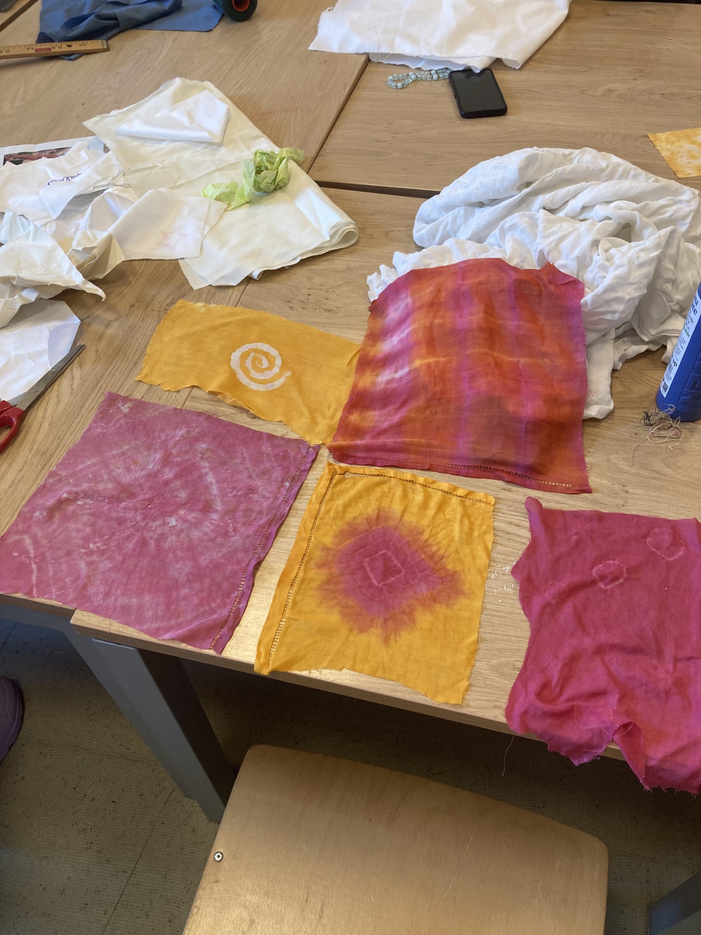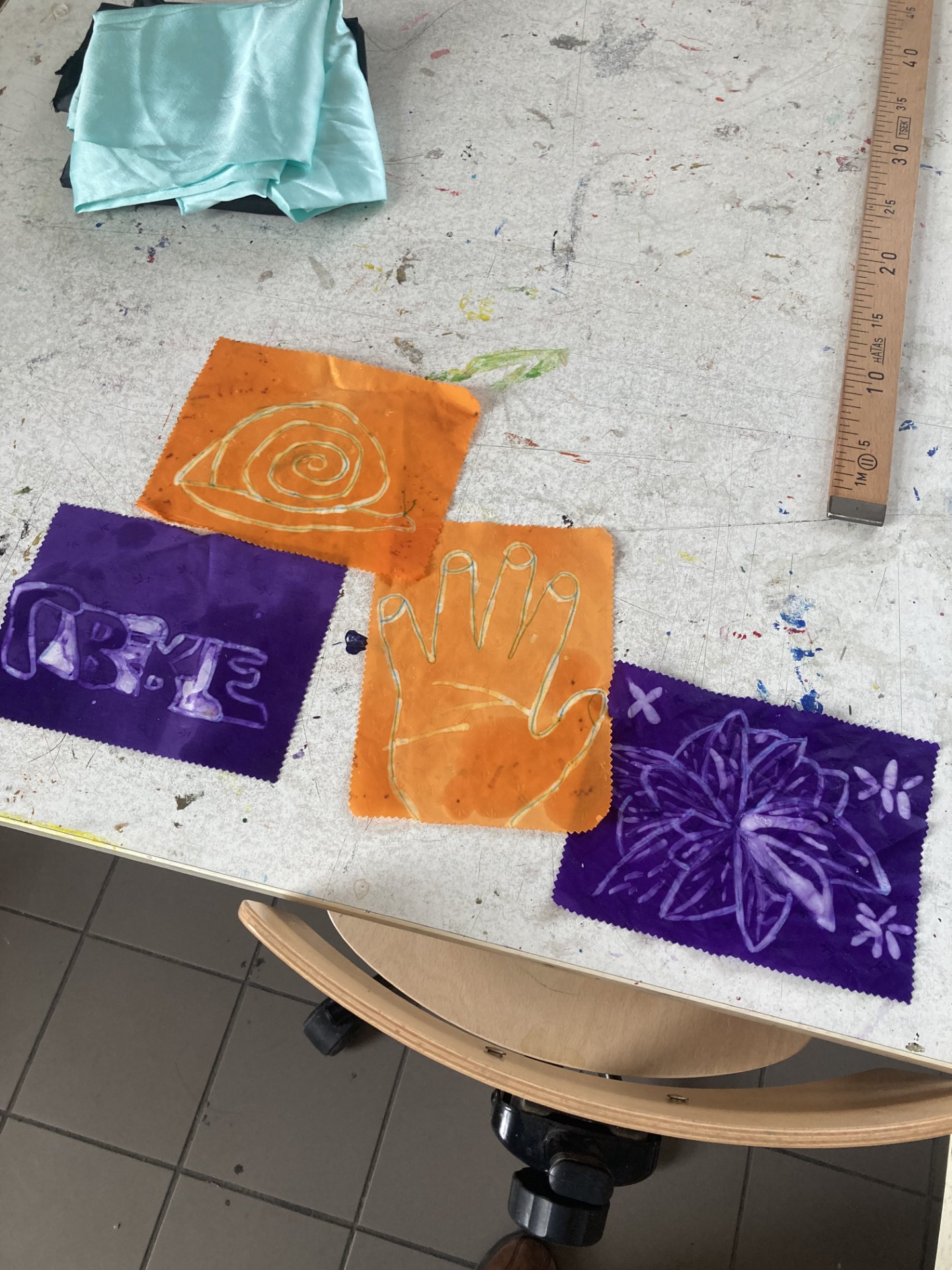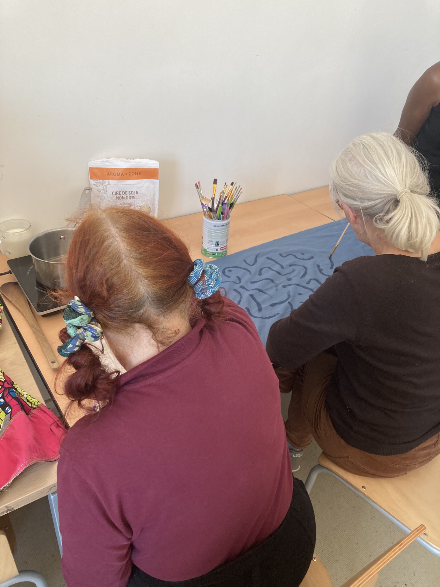 Les participant.e.s ont expérimenté deux techniques différentes. Pour la première, on commence par plier le tissu puis le serrer avec une ficelle. On plonge ensuite le textile dans la teinture et cela crée des motifs aléatoires. Pour la deuxième, on utilise de la cire qu'on vient appliquer au pinceau. Les parties recouvertes vont ainsi servir de caches lors de la coloration. Pour finir, on passe le tissu au fer à repasser pour enlever la cire.