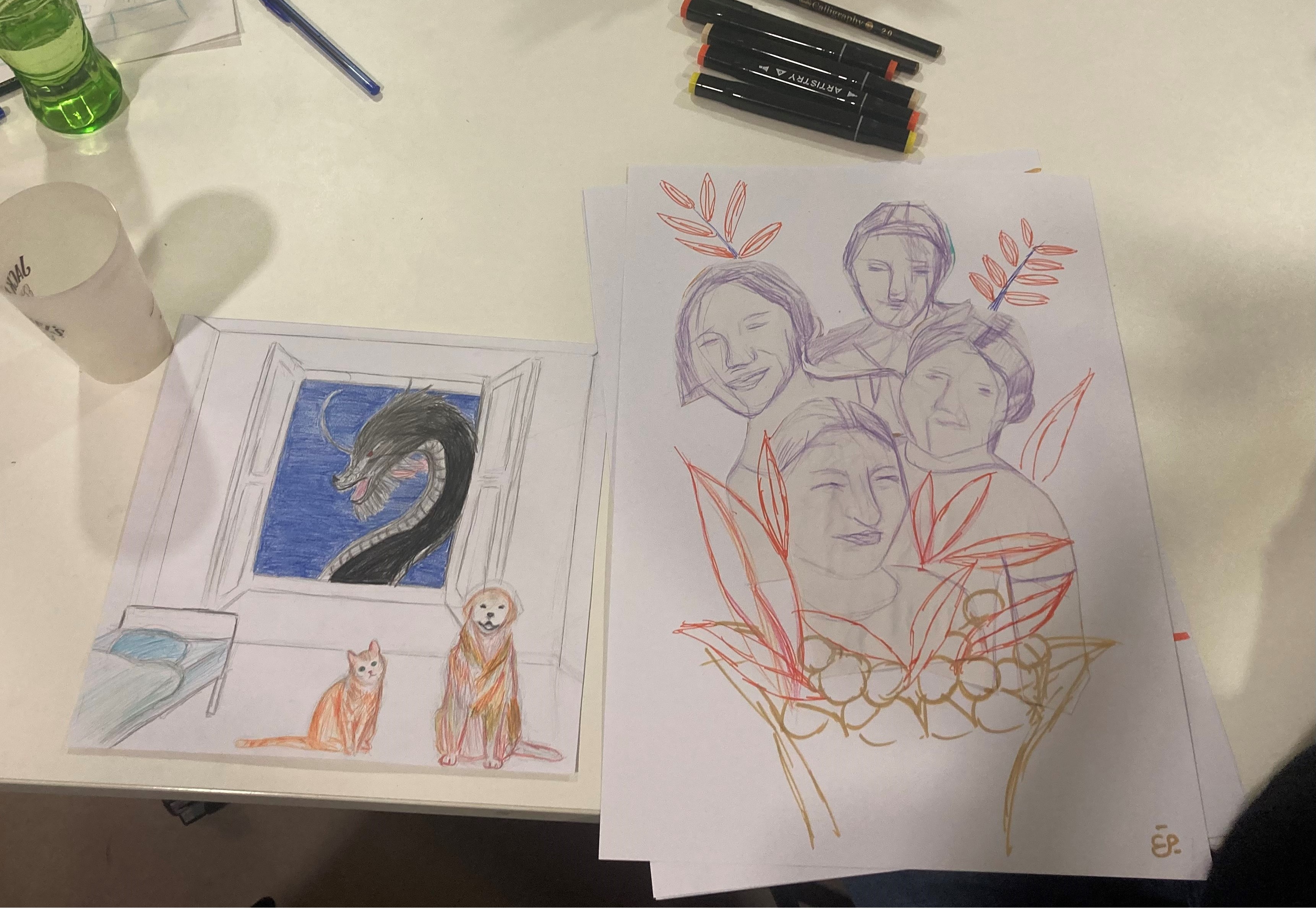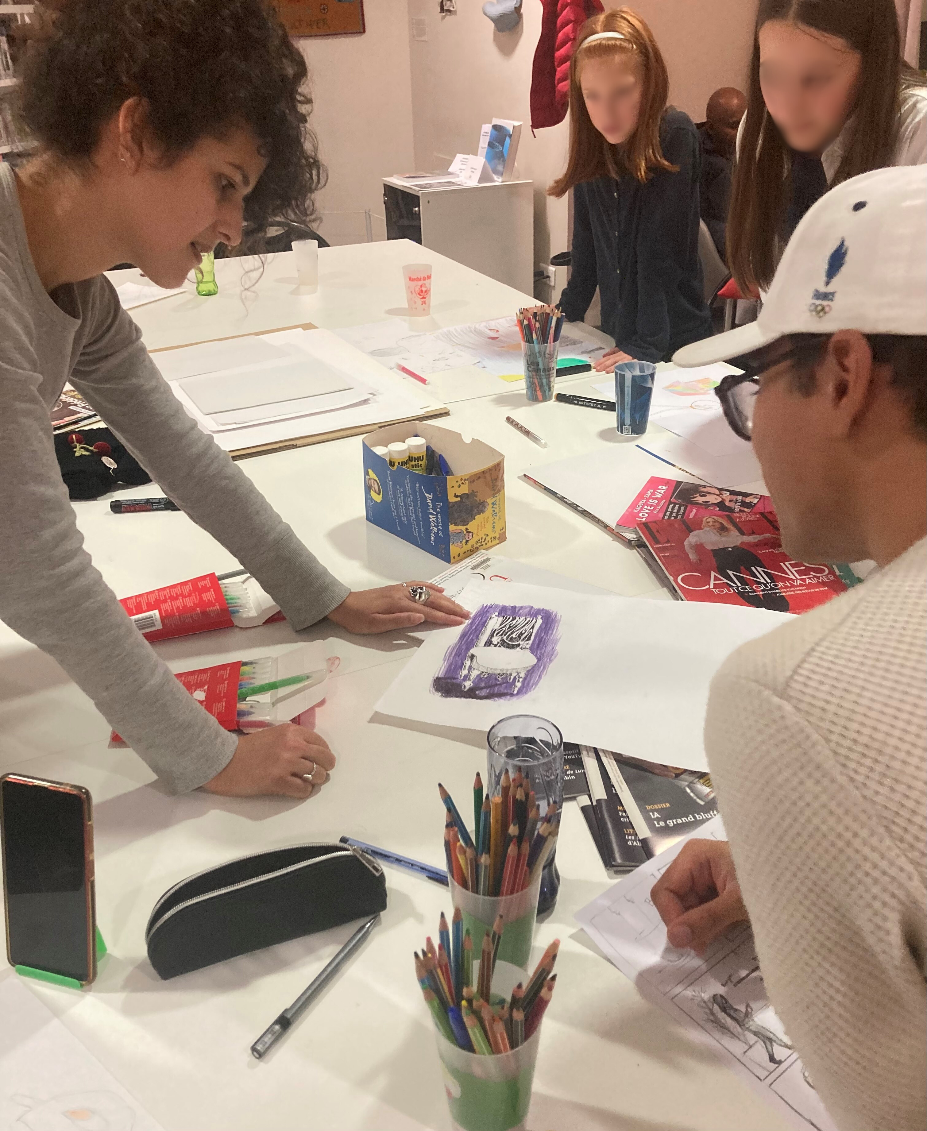 Le 15 novembre, l'artiste Neila Czermak Ichti est intervenue à la médiathèque dans le cadre d'un atelier de dessin. En lien avec l’œuvre Les Anges de Porte Dorée qui représente une scène fantastique de fête foraine, chaque participant.e, adulte ou adolescent.e, a inséré un élément magique dans une scène de son quotidien. L'artiste avait ramené des images de son propre travail et d'autres artistes qui l’inspirent, comme l'auteur de BD David K, autour de la notion de "réalisme magique".
