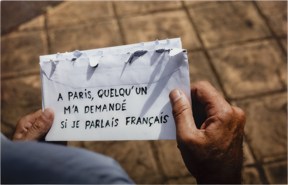 Thierry Fontaine explore l’identité à travers image et texte. Un message simple, écrit sur une enveloppe, révèle un malaise profond : celui de ne pas se sentir pleinement légitime dans une langue ou un lieu.