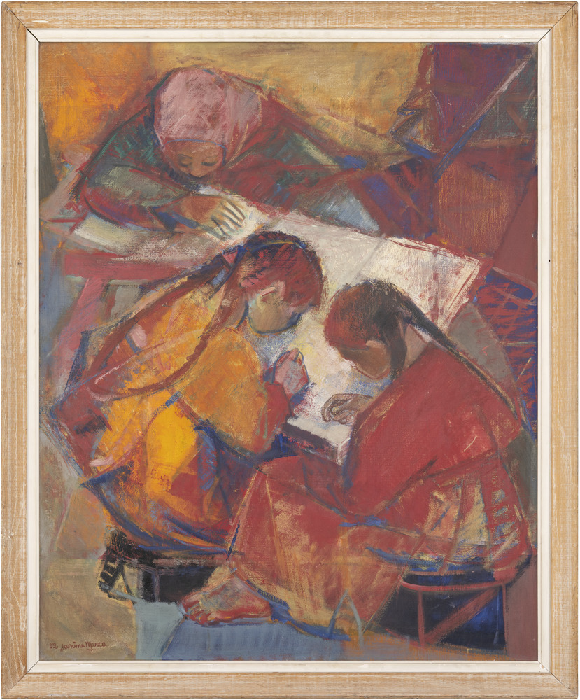 Pour les familles plus modestes, le textile peut aussi être un vecteur de gains économiques. Au début du XXe siècle, les femmes représentent les deux tiers de la main-d’œuvre des filatures et tissages avec deux millions d’emploi.[1] Les femmes tiennent de petits commerces comme vraisemblablement dans le tableau de Marcel Paul Combellas ou œuvrent au sein d’ateliers comme dans l’œuvre de Janine Marca-Tisseyre, sur lequel les brodeuses ont l’air encore adolescentes. Cette scène localisée à Fez au Maroc décentre les pratiques textiles dans un autre contexte que la France, toute culture ayant son propre héritage dans ce domaine.